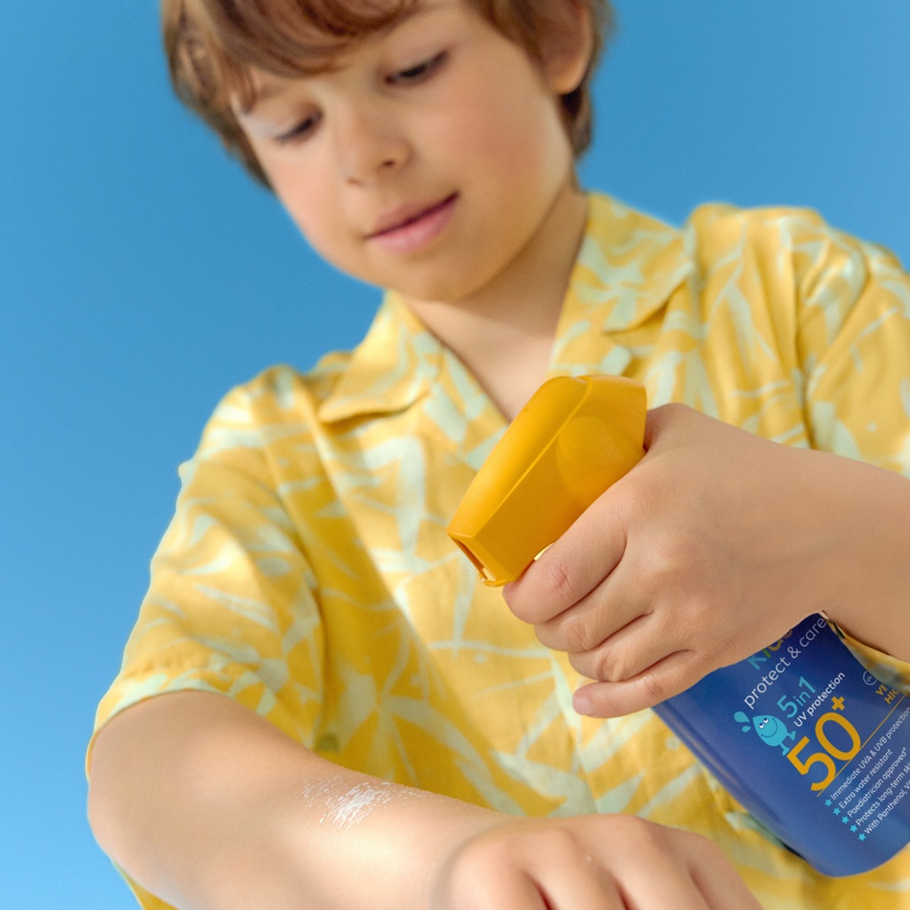 Gebruik voor kinderen ook minstens SPF 30 – of liever nog 50+ – bijvoorbeeld Kid's Coloured Sun Spray van NIVEA met SPF 50+. Vooral voor de kleintjes raden we waterdichte producten aan die bescherming bieden, ook tijdens zwemmen en spetteren, zoals NIVEA Kids Swim & Play Sun Lotion.