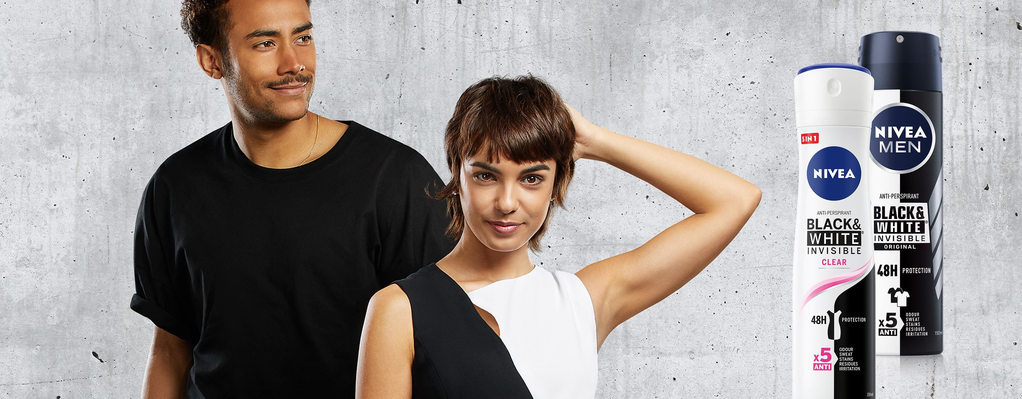 Deodorant roller of spray? Voor dames of heren? Vind de beste NIVEA Black & White voor jou en je favoriete kledingstuk.