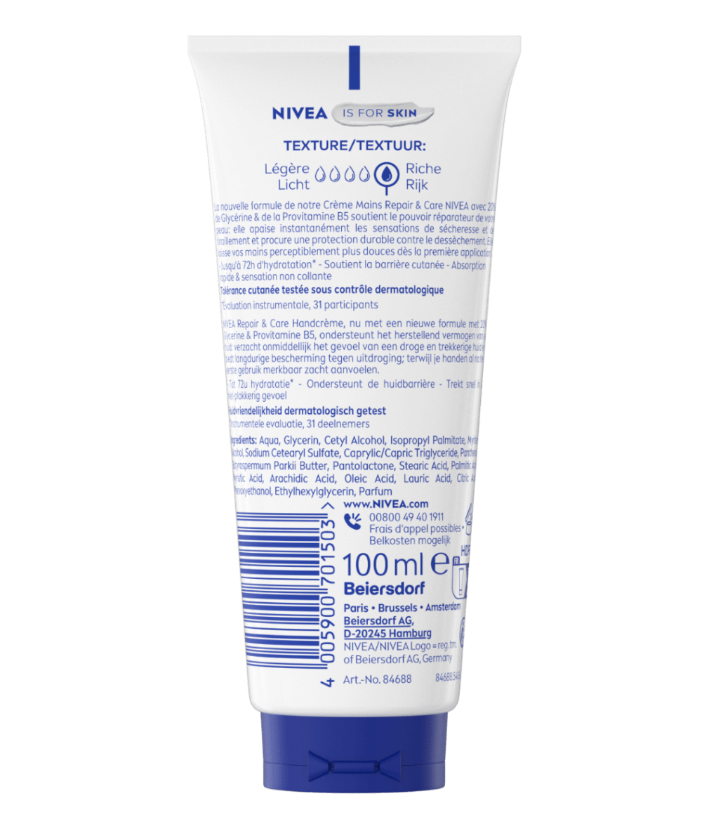 Repair & Care Handcrème met 20% Glycerine en Provitamine B5 voedt intensief en herstelt extreem droge huid. Biedt directe verlichting en 72u* lang hydratatie.