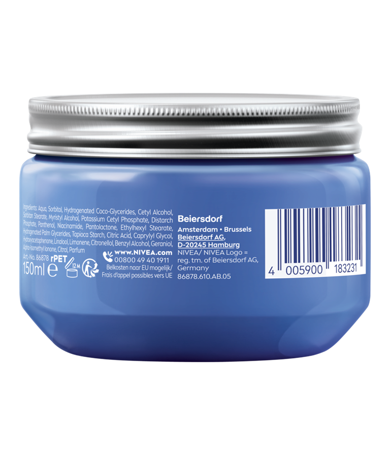 Water, Sorbitol, Gehydrogeneerde kokosglyceriden, Cetylalcohol, Sorbitan Stearate, Myristylalcohol, Potassium Cetyl Phosphate, Distarch Phosphate, Panthenol, Niacinamide, Pantolacton, Ethylhexyl Stearate, Hydrogenated Palm Glycerides, Tapiocazetmeel, Citroenzuur, Caprylyl Glycol, Hydroxyacetofenon, Linalool, Limonene, Citronellol, Benzyl Alcohol, Geraniol, Alpha-Isomethyl Ionone, Citral, Parfum