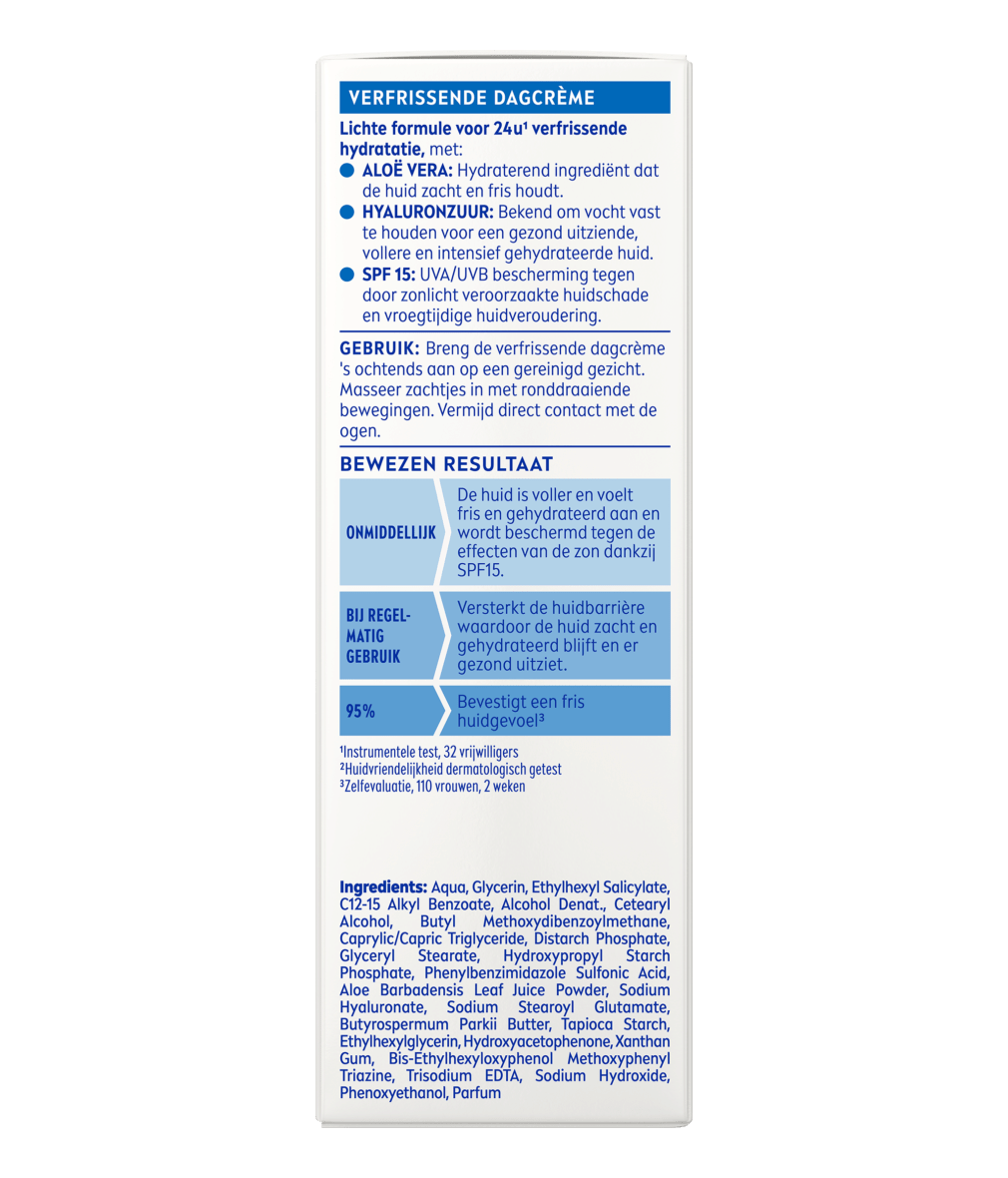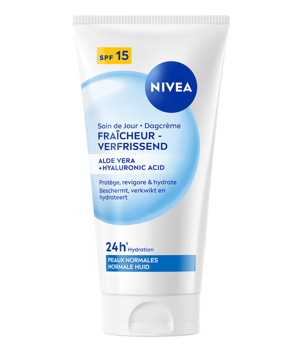 NIVEA Verfrissende Dagcrème biedt 24 uur* frisse hydratatie en helpt het natuurlijke vochtgehalte van je huid in balans te houden. De formule met Aloë Vera en Hyaluronzuur verfrist en geeft je huid meer volume. SPF 15 beschermt tegen door zonlicht veroorzaakte huidbeschadiging en vroegtijdige huidveroudering. Met deze verfrissende dagcrème voor de normale huid voelt je huid elke dag diep gehydrateerd, zacht en verkwikt. Huidvriendelijkheid dermatologisch getest.