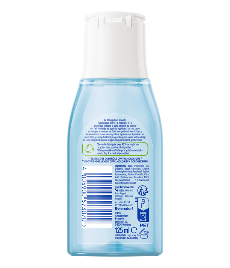 Dit artikel heb ik bij AH terug mogen geven. De voorganger van deze oogmakeup remover was een topper! Hyaluronzuur is niet direct geschikt om oogmakeup te verwijderen. Na een aantal keer grondig ‘boenen’ was het resultaat een bloeding in het oogwit en verder zat de mascara nog onder mijn ogen , dit spul doet totaal niet wat het belooft. Irritatie aan de oogleden, 2 weken geen lenzen kunnen dragen…voor mij onacceptabel!! Mijn advies zou zijn, koop dit in ieder geval niet. En voor Nivea; haal dit direct uit de handel en doe de vorige formule maar weer. Het aparte was dat de dame die het artikel innam, zo’n beetje dezelfde klachten van dit product ondervonden had.