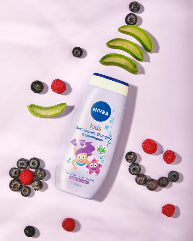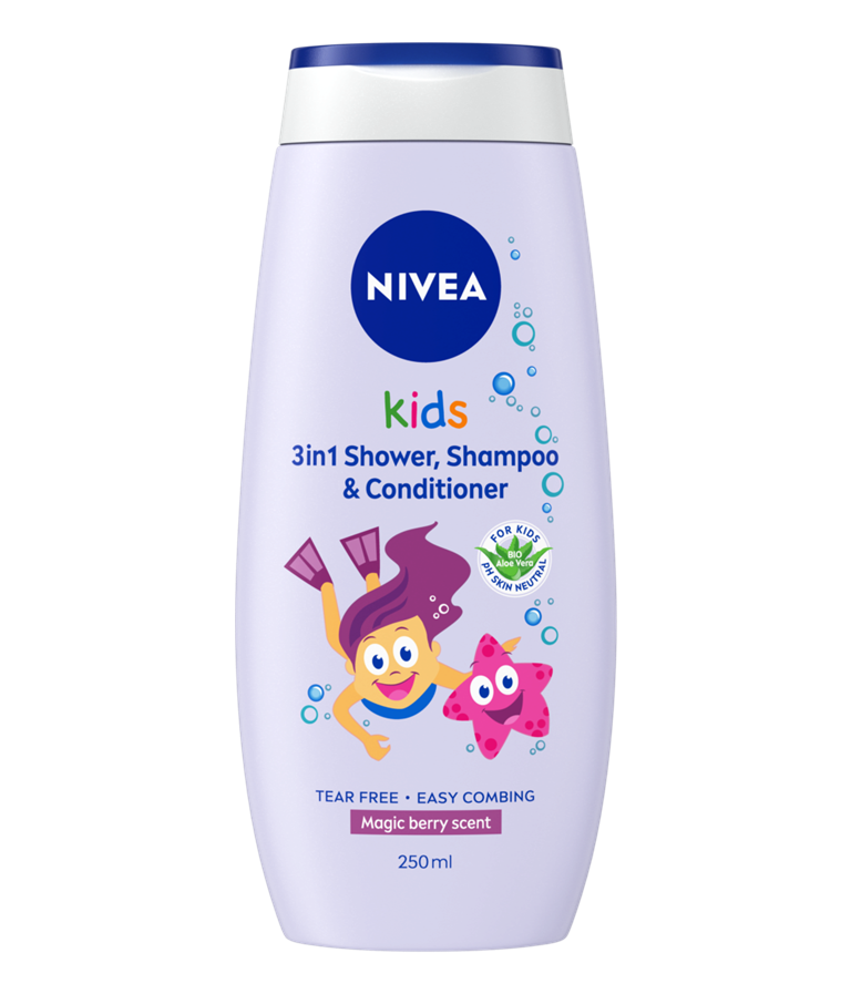 NIVEA Kids Magic Berry 3in1 Douche, Shampoo & Conditioner 250ml, reinigt en verzorgt de gevoelige huid en het haar van kinderen op milde wijze.