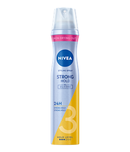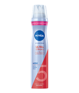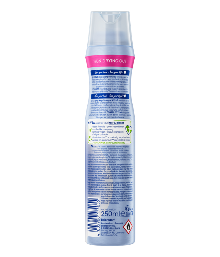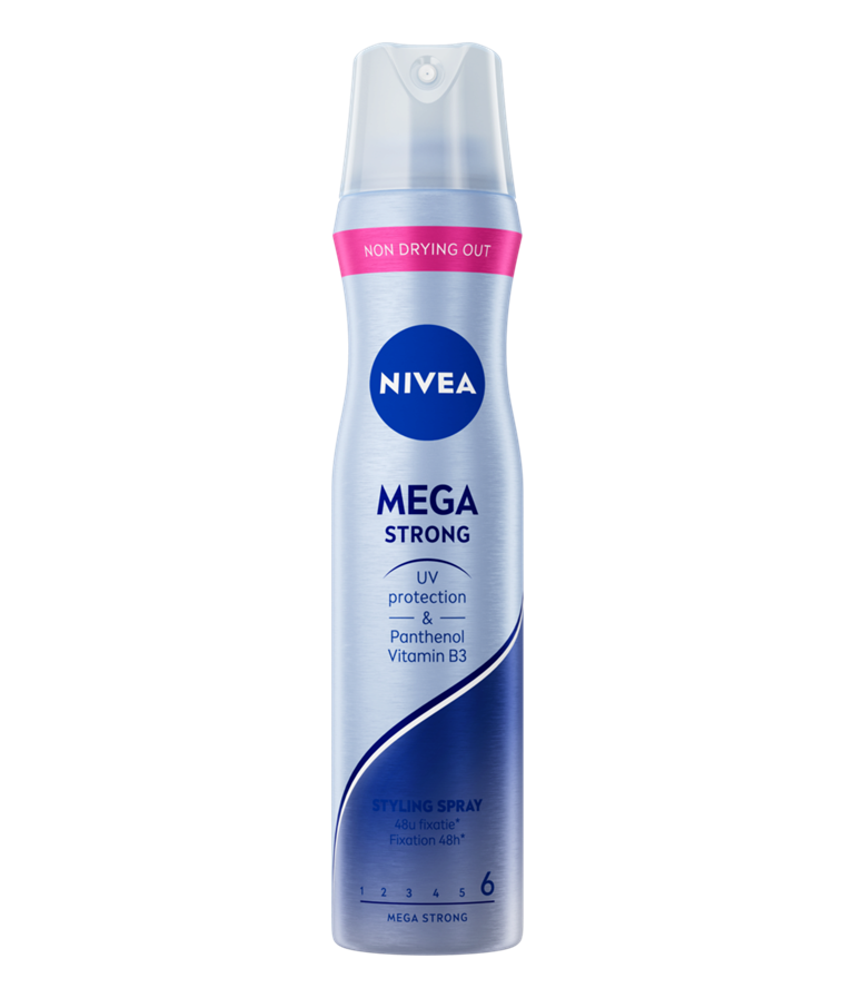 NIVEA Mega Strong Styling Spray 250ml met de innovatieve formule met panthenol en vitamine B3 beschermt het haar, droog het haar niet uit en zorgt voor mega sterke fixatie tot wel 48 uur.