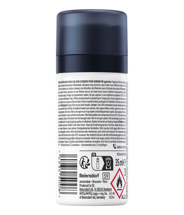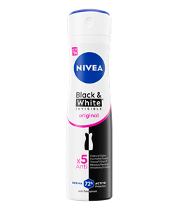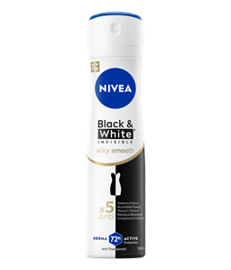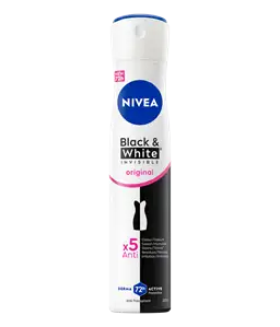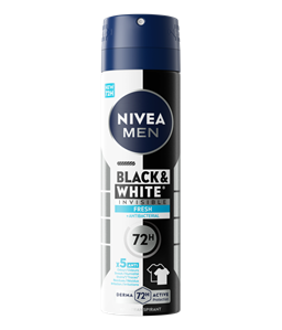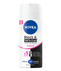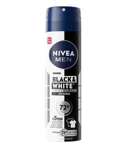 NIVEA Black & White Invisible spray biedt bescherming tegen witte vlekken op zwarte kleding en tegen gele vlekken op witte kleding dankzij de unieke gepatenteerde anti-vlekken technologie. Het is een betrouwbare 72 uur anti-transpirant bescherming, sterk tegen zweet en geurtjes, die je huid verzorgt.