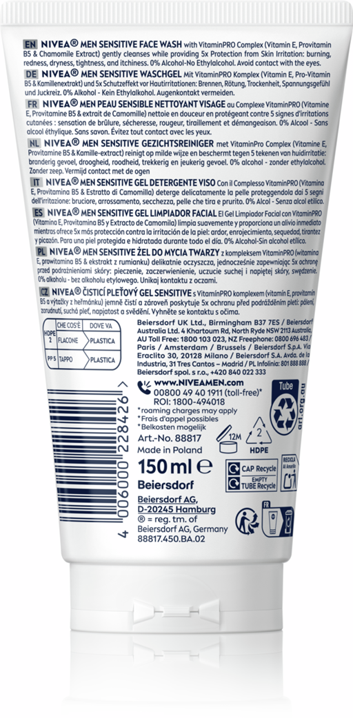 NIVEA MEN Sensitive Gezichtsreiniger XXL 100ml is een milde en verzachtende reiniger die speciaal is ontwikkeld voor de gevoelige huid. Het verwijdert onzuiverheden effectief en laat de huid na elk gebruik fris en comfortabel aanvoelen.
