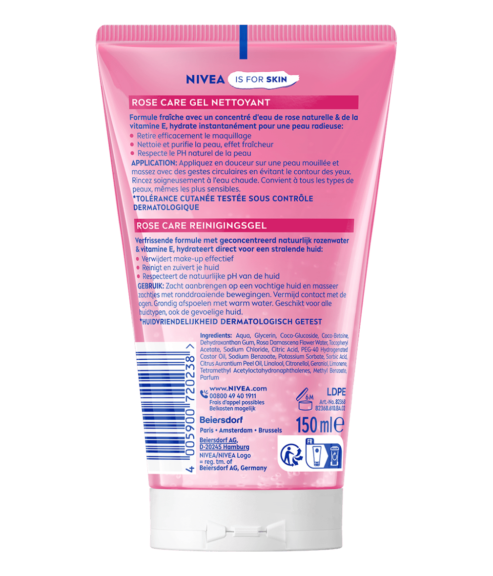 De NIVEA Rose Care Wash Gel met geconcentreerd natuurlijk rozenwater en vitamine E verwijdert make-up effectief, reinigt en zuivert de huid.