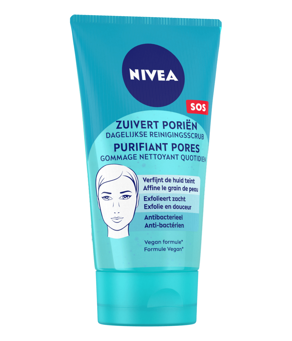 NIVEA Essentials Dagelijkse Reinigingsscrub heeft een dubbele werking, het voorkomt puistjes en mee-eters daarnaast hept het de poriën te openen. De scrubdeeltjes zorgen voor een perfect egale huid.