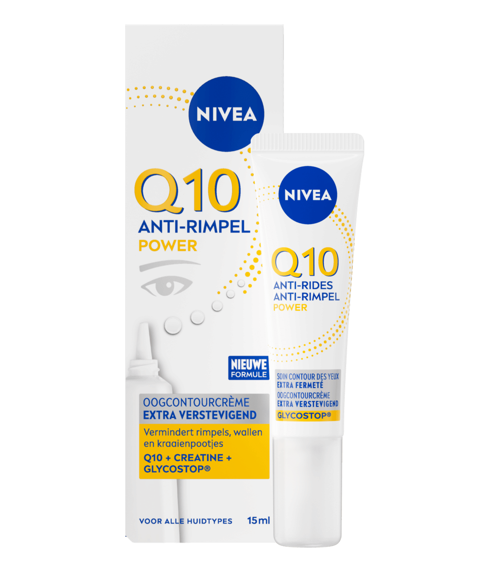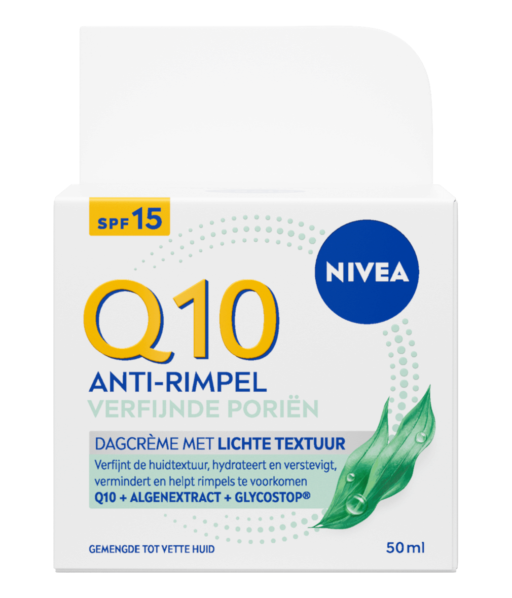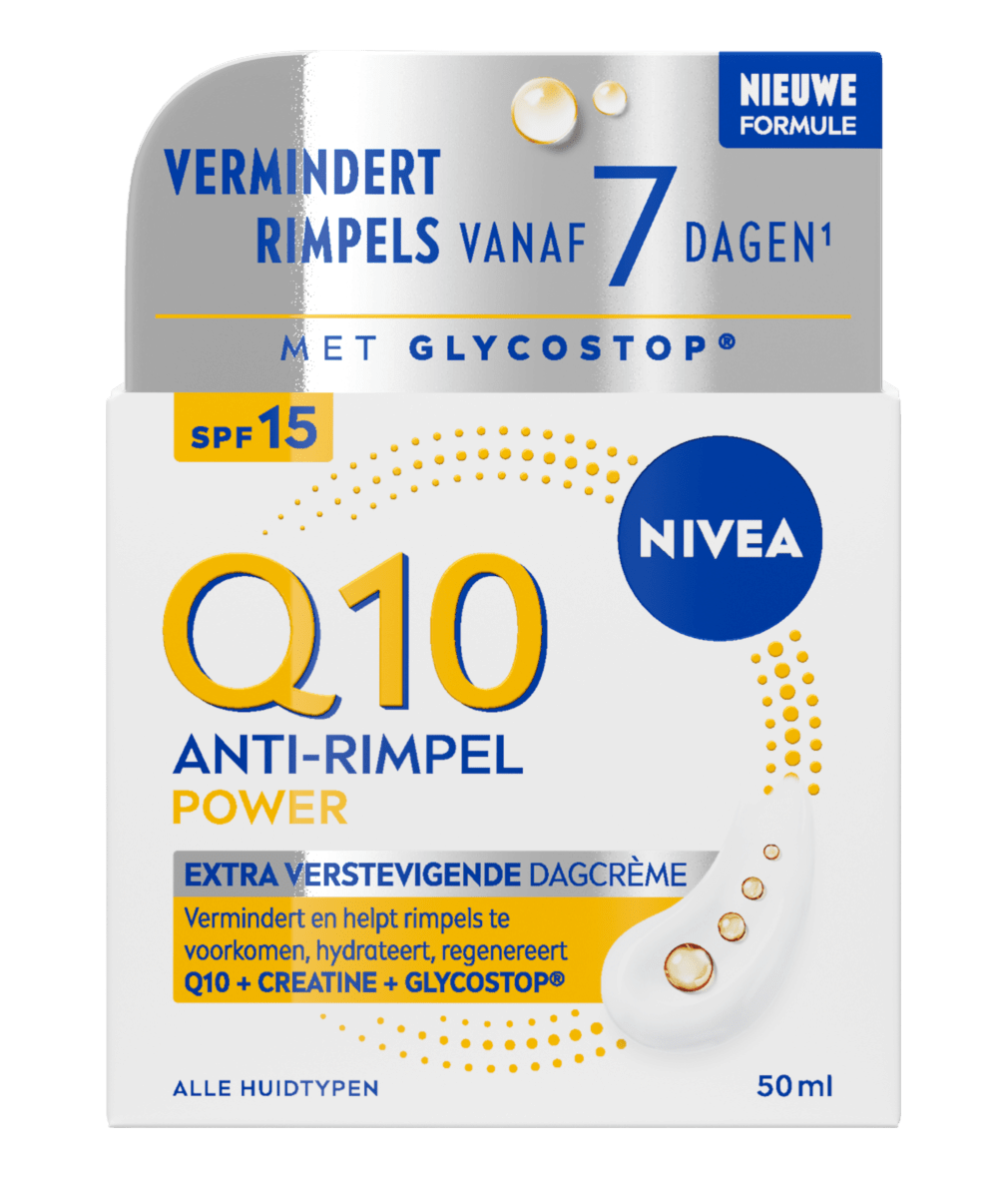 NIVEA Q10 Anti-Rimpel Power Dagcrème is verrijkt met NIVEA's puurste kwaliteit, 100% huid-identieke Q10 met dubbele werking. Onze verbeterde formule biedt anti-rimpelbescherming om huidcellen te beschermen tegen schade door vrije radicalen en externe invloeden. Daarnaast geeft het je huid energie om te herstellen. De innovatieve formule met SPF 15 is speciaal ontwikkeld om 3 soorten rimpels te verminderen: voorhoofdsrimpels, kraaienpootjes en rimpels rond wangen & mond.