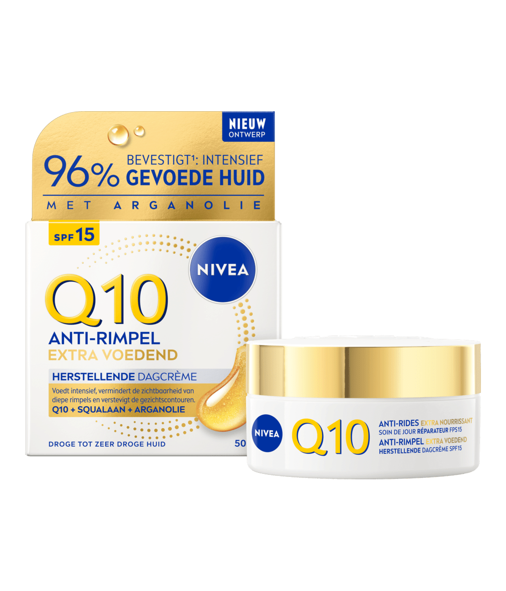 NIVEA Q10 Power Anti-Rimpel Verzachtende Dagcrème SPF15 50ml vermindert rimpels zichtbaar* en hydrateert de gevoelige huid intensief om uitdroging, een trekkerig gevoel en roodheid te verminderen.