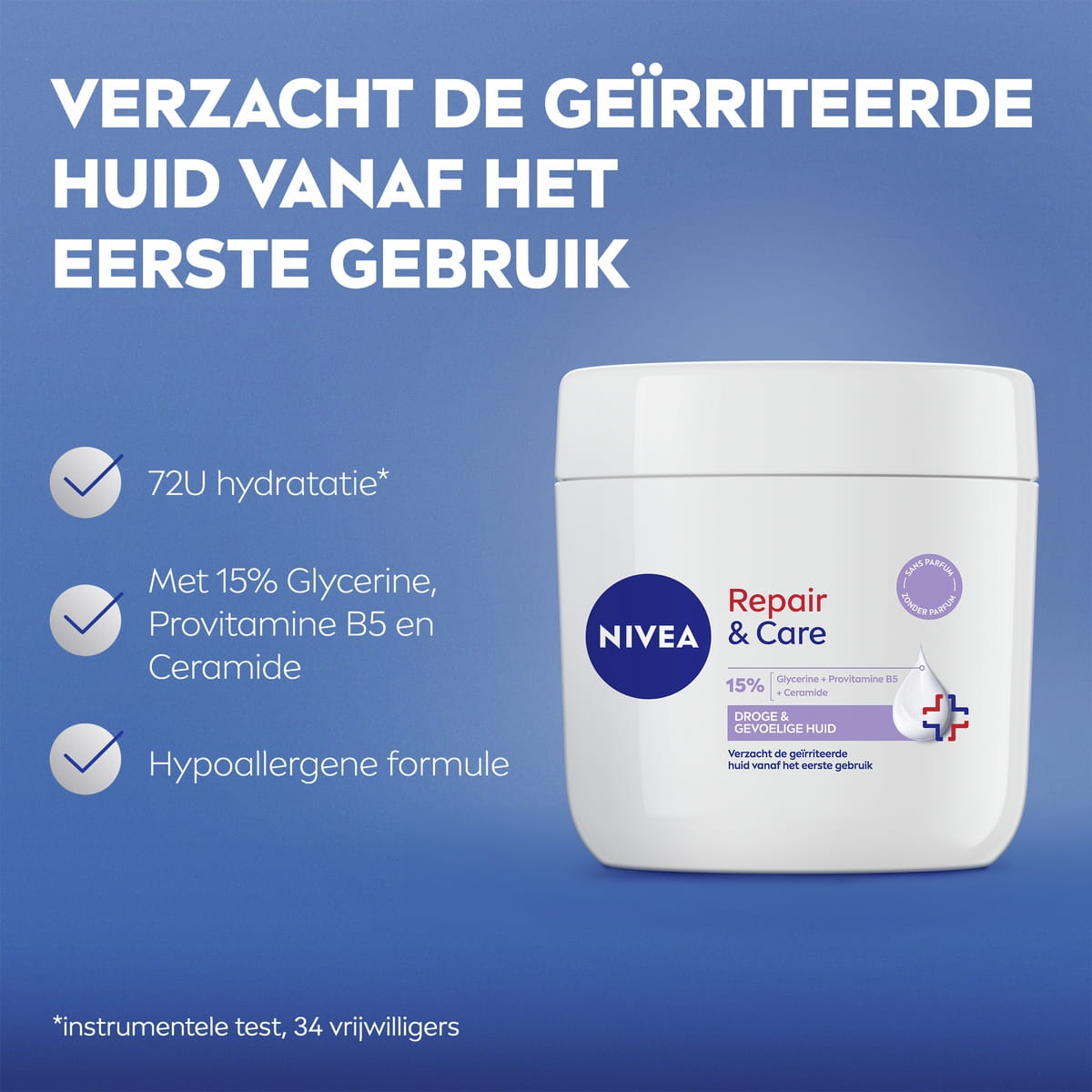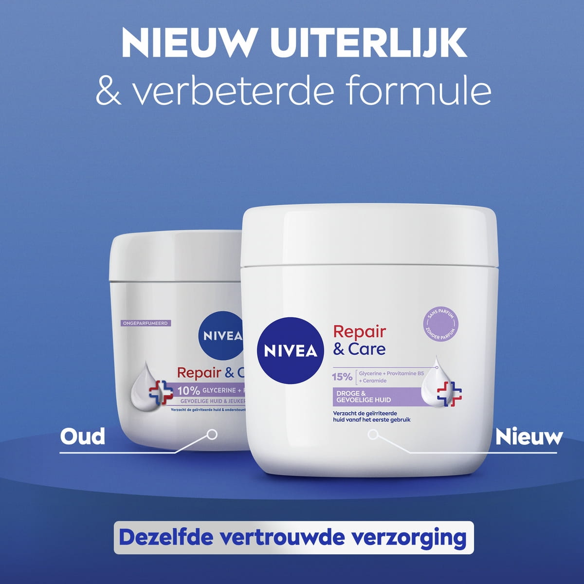 Ontdek NIVEA Repair & Care crème zonder parfum, perfect voor het verzachten van de droge en gevoelige huid. De zachte, hypoallergene formule zorgt voor intensieve verzorging en kalmeert irritatie vanaf het eerste gebruik. Deze crème is geschikt voor kinderen van 3 jaar en ouder. Huidvriendelijkheid dermatologisch goedgekeurd.
