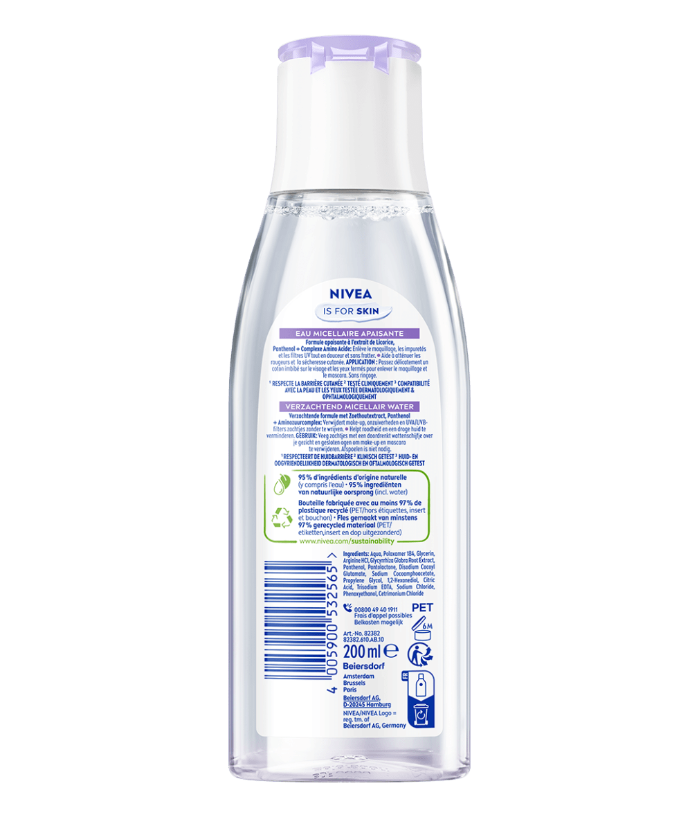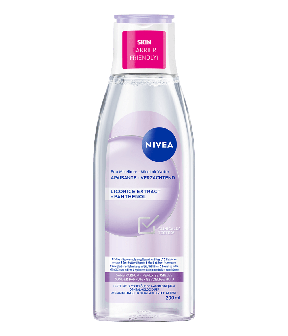 Verzacht en reinig je huid met NIVEA Verzachtend Micellair Water. Met zoethoutextract, panthenol en aminozuurcomplex verwijdert het op milde wijze make-up, onzuiverheden, vuil en SPF, terwijl het roodheid en droogheid vermindert, waardoor het perfect is voor de gevoelige huid.